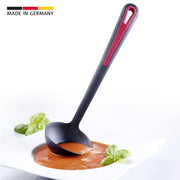 赤いインレイ付きの人間工学に基づいた快適なソフトタッチハンドルは、しっかりとした快適なグリップを提供します。210°C / 410°Fまで耐熱性があり、BPAフリー、食器洗い機対応、スペースを節約するための吊り下げループが付いています。