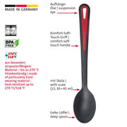 高品質のポリアミドで作られており、コーティングされた調理器具を傷から守ります。赤いインレイが施された人間工学に基づいた快適なソフトタッチハンドルは、しっかりとしたグリップを保証します。耐熱温度は270°Cまで、BPAフリー、食器洗い機対応、スペースを節約できる吊り下げループ付きです。