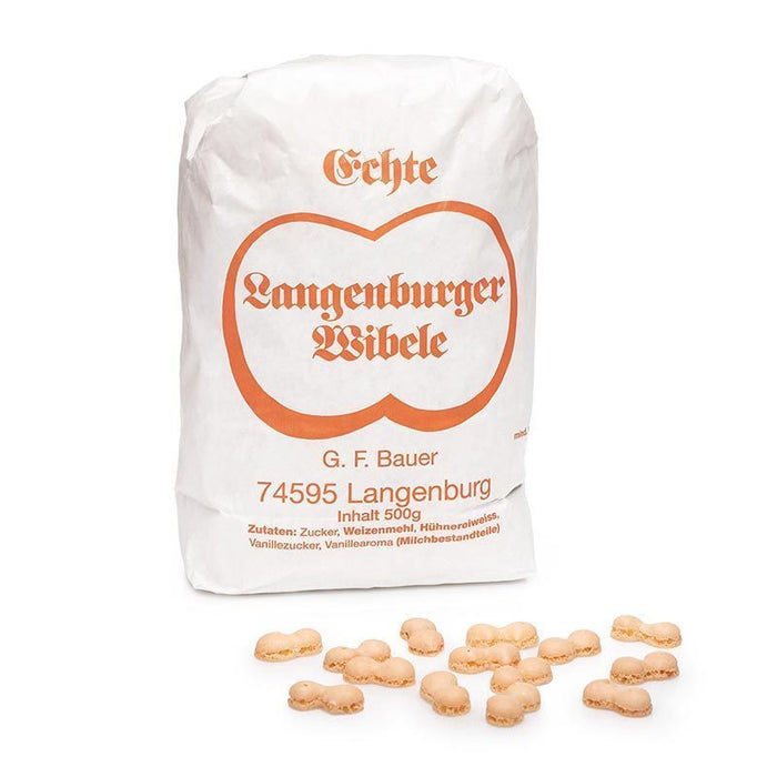 エヒテ・ランゲンブルガー・ヴィーベレは、200年以上にわたり若者から年配者まで人気のあるお菓子です。ビスケット生地から作られ、バウアー家がバニラシュガーを自家製しています。この甘いペイストリーはロシアパンに似ていますが、ココアは含まれていません。淡い茶色に焼かれ、一晩休ませた後、ペアで焼き型に絞り出されます。長さ22mm、幅12mmのペイストリーは靴底の形をしています。
