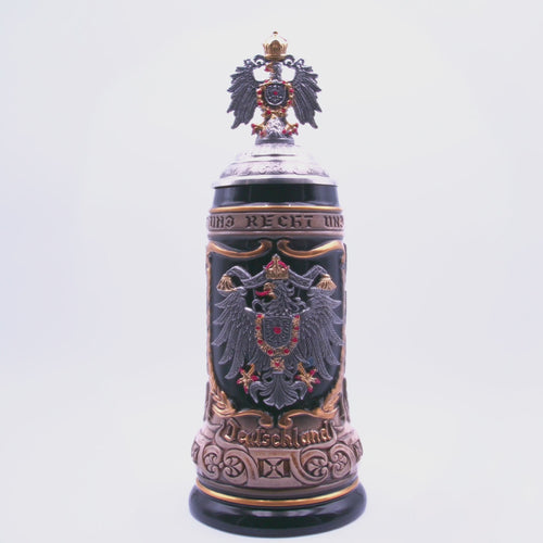 This exquisitely handcrafted German beer stein, featuring a beautifully painted pewter relief crest and the iconic Eagle motif, is more than just a drinking vessel. It’s a tribute to German artistry, symbolizing strength, freedom, and pride. With a capacity of 1/2 liter (16.9 oz) and a specially designed pewter relief lid (RD), this stein embodies tradition and elegance, making it an ideal collector’s piece or thoughtful gift.