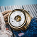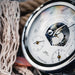 Barómetro marítimo con movimiento visible, combinado con termómetro e higrómetro.