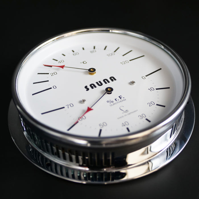 Fabricado con una carcasa de latón cromado y una cubierta de vidrio mineral, este termómetro e higrómetro para sauna de 150 mm de diámetro garantiza durabilidad y estilo. Mejore sus sesiones de sauna con la precisión confiable de LUFFT.