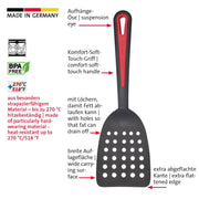 The ergonomic comfort soft-touch handle with red inlay ensures a secure and comfortable grip. BPA-free, heat-resistant up to 270 °C, dishwasher safe, and equipped with a hanging loop for convenient storage.